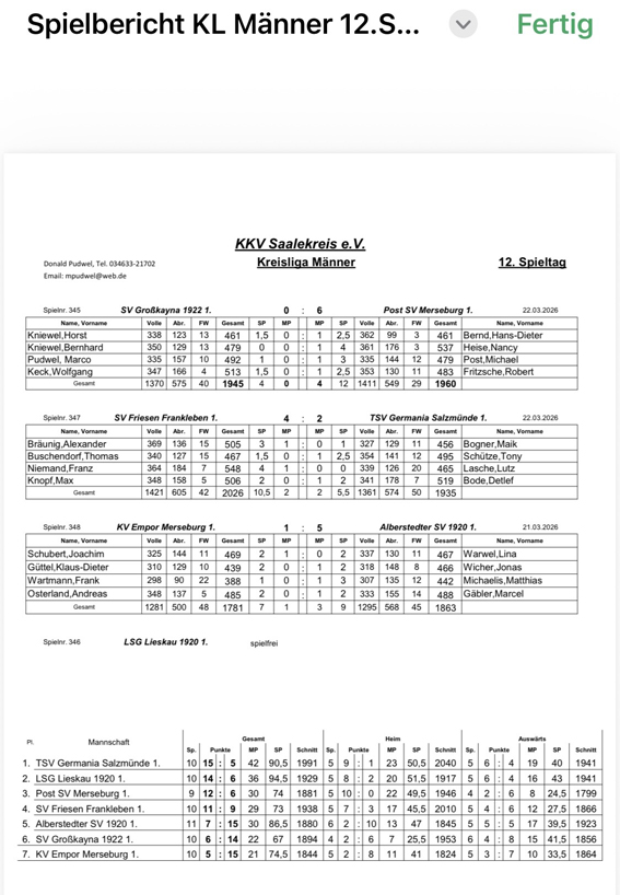 Die Kegelmänner des SV Friesen Frankleben setzen ihre starke Serie in der 1. Kreisliga im Saalekreis fort. Nach einem Remis im September gegen KV Empor Merseburg und einem überzeugenden Heimsieg im Oktober gegen den SV Großkayna punktete die Mannschaft auch Anfang November auswärts beim Alberstedter SV. Mit diesem wichtigen Erfolg schoben sich die Friesen-Kegler auf Platz 3 der Tabelle – ein beachtliches Ergebnis, das den Aufwärtstrend der vergangenen Monate eindrucksvoll bestätigt.