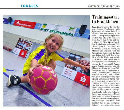 Am ersten Montag im August bewegten sich endlich die Sportler/innen des SV Friesen Frankleben in der modernen und wunderschönen neuen Harry-Kaßler-Sporthalle in Frankleben. Seit der Hallensperrung im August 2015 ist der über 3 Millionenbau nun nutzungsfähig. Die erste Mannschaft, wie auf dem Kubak-Foto ersichtlich, war die weibliche Jugend E/D (9-12 Jahre), die ihr Training absolvierte.
