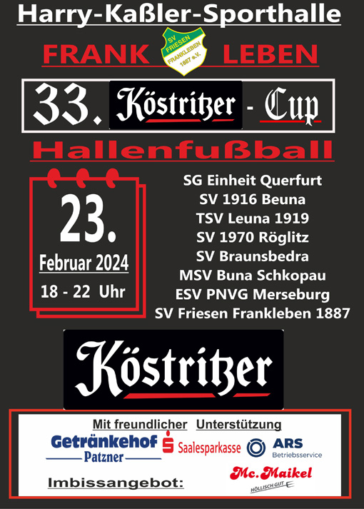 Am 23.2.2023 steigt dann der 33. Köstritzer Cup um die Hallensaison der Fußballer abzuschließen, dazu fand im Januar die Gruppenauslosung im Getränkehof Patzner in Langeneichstädt, mit unserem Abteilungsvertreter Christoph Nentwig, Mike Patzner und Niels Rozynek dem Vertreter der Bitburger Braugruppe, statt.