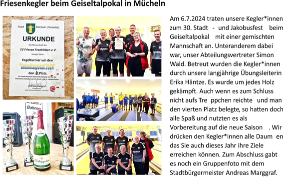 Die Kegler des SV Friesen Frankleben konnten ihre erfolgreiche Saison mit einem Erfolg krönen, als sie beim Pokal des Landrats des Saalekreises den 2. Platz belegten. Das Team zeigte eine starke Leistung und überzeugte mit ihrem Können auf der Kegelbahn.