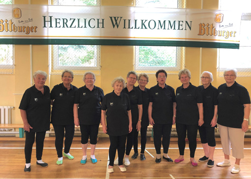 Seit der Gründung sind heute noch vier Frauen dabei: Karla Müller (76/2.v.r.), die die Sportgruppe leitet, Lisa Lenk (85/3.v.l.), Giesela Lohse (80/4.v.l.) und Gudrun Heinz (79/5.v.l.). Dazu gesellen sich Dorothea Erbert (81/6.v.l.), Anna Giebler (85/3.v.r.), Hannelore Kindervater (85/links), Margarete Kobe (81/2.v.l.), Carola Strohm (74/4.v.r.) und Regina Theile (78/rechts).