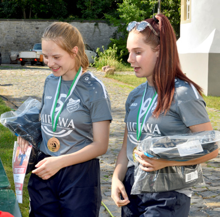 Sportförderer Saalesparkasse würdigte die drei besten Torschützinnen, Vanessa Mischner (links), Paula Hebestreit und Annabell Niemtz (rechts auf dem Kubak-Foto) ebenfalls mit einem Geschenk.