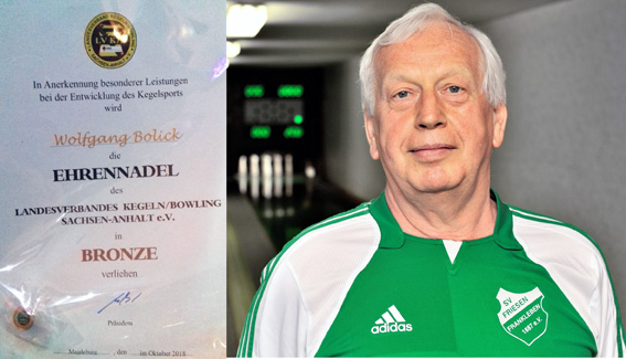 Sportfreund Lothar Rödger (stellv. Vorsitzender) vom Kreis-Kegelverein Saalekreis zeichnete den umtriebigen Sportfreund dann noch mit der Ehrennadel des Landesverbandes Kegeln/Bowling Sachsen-Anhalt e.V. in Bronze aus.