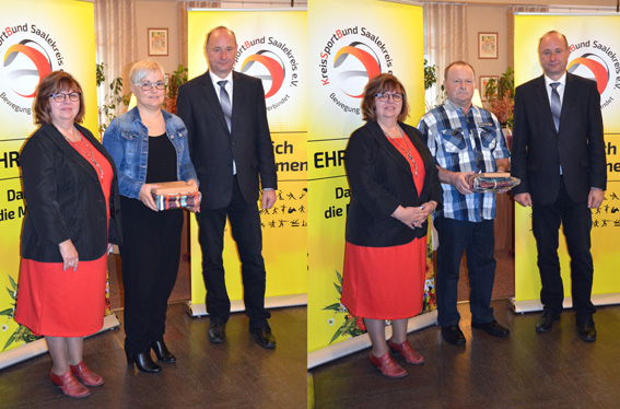 Ein Ehrengeschenk überreicht von Angela Heimbach (Präsidentin des KSB Saalekreis) und Vize-Landrat Hartmut Handschak erhielten Conny Leopold (Handball Übungsleiterin Minis, Schiedsrichter und Vereinsschriftführer) und Bernd Leopold (Handball ÜL Nachwuchs, ÜL KITA-Projekt und Sportstättenmitarbeiter). Wolfgang Bolick, der seine langjährigen Verdienste bei der Wartung und Pflege der elektrischen Anlagen in der ehemaligen Harry-Kaßler-Halle und auf der Kegelanlage hat, musste kurzfristig der Veranstaltung fern bleiben.