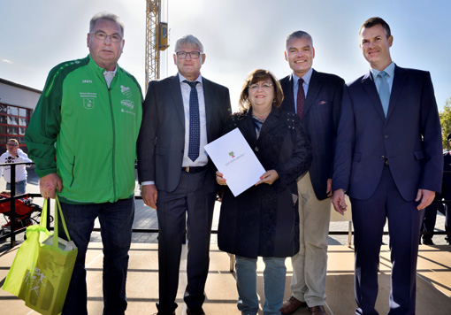 der Innen- und Sportminister Holger Stahlknecht (2.v.r) die Gelegenheit zur Übergabe des Fördermittelbescheid für den Sporthallenneubau in Frankleben, den der Braunsbedraer Bürgermeister Steffen Schmitz (r.), im Beisein des Franklebener Ortsbürgermeister Günter Küster (2.v.l.), der KSB-Präsidentin Angela Heimbach (3.v.l.) und Friesen-Vorsitzender Jürgen Pohle (l.), dankend entgegennahm.