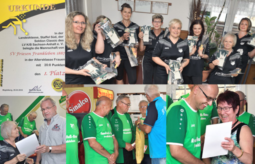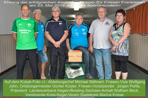 Mit Unterstützung der Getränkepartner "Wernesgrüner" (Gebietsverkaufsleiter Niels Rozynek) und "Sinalco" (Gebietsverkaufsleiter Holger Arbes) fand auf der Franklebener Kegelbahn die Ehrung statt, die der Präsident des Landesverband Kegeln/Bowling Sachsen-Anhalt Wolfram Beck und die Vorsitzende des Kreis-Kegler-Verein Saalekreis Marina Kriese vornahmen.