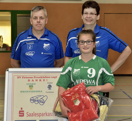 Das Übungsleiterduo Cornelia Franz/Torsten Langner hatten interessierte Mädchen gefunden, die wettkampfmäßig Handball spielen wollten. Gleich in der ersten Saison kam das junge Team in der Bezirksliga auf Platz fünf und ein Jahr später erkämpften die Friesen die Bronzemedaille. Eine Altersklasse höher, im nun dritten Handballjahr wurde die weibliche Jugend D Vizebezirksmeister und in diesem Jahr ungeschlagen Bezirksmeister. Für Lilli Döscher, die in den vier Jahren immer zu den torgefährlichsten Spielrinnen gehörte, war es ein schöner Abschluss im Friesentrikot. Bei der Eröffnung der 10. Kreis-Kinder- und Jugendspiele wurde sie feierlich durch Angela Heimbach (Präsidentin des Kreissportbundes Saalekreis) an die Sportschule verabschiedet. Auch der Friesenvorstand wünschte der jungen Nachwuchssportlerin viel Erfolg auf dem leistungssportlichen Weg und überreichte ein Präsent zur Erinnerung an die Handballzeit in Frankleben.